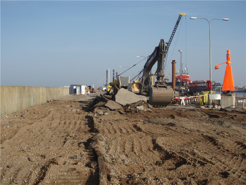 I Esbjerg Havn fjernede vi 860 Lbm. havnekaj, som var støbt ovenpå Spuns. Spunsene skar vi ca. 2 meter under terræn. Derudover fjernede vi også 4 Pier og tilhørende fundamenter. Der blev i alt godt 5000 tons knust beton ud af projektet, og vi fik en hel del erfaring med i baggagen!